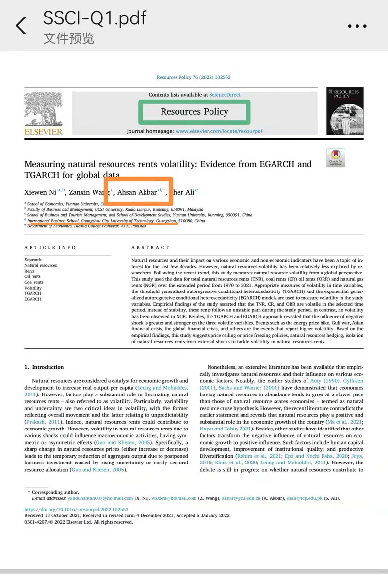 我院Akbar副教授以通讯作者身份在 SSCI 来源期刊Resources Policy (IF=5.634) 发表学术论文 “Measuring natural resources rents volatility: Evidence from EGARCH and TGARCH for global data”。