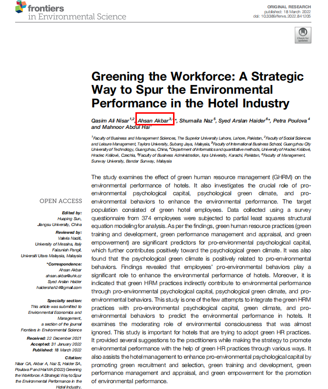 3月18日,我院Akbar副教授以第二作者及通讯作者身份在国际权威期刊《Frontiers in Environmental Sciences》(IF=4.581)发表论文 “Greening the Workforce: A Strategic Way to Spur the Environmental Performance in the Hotel Industry”。