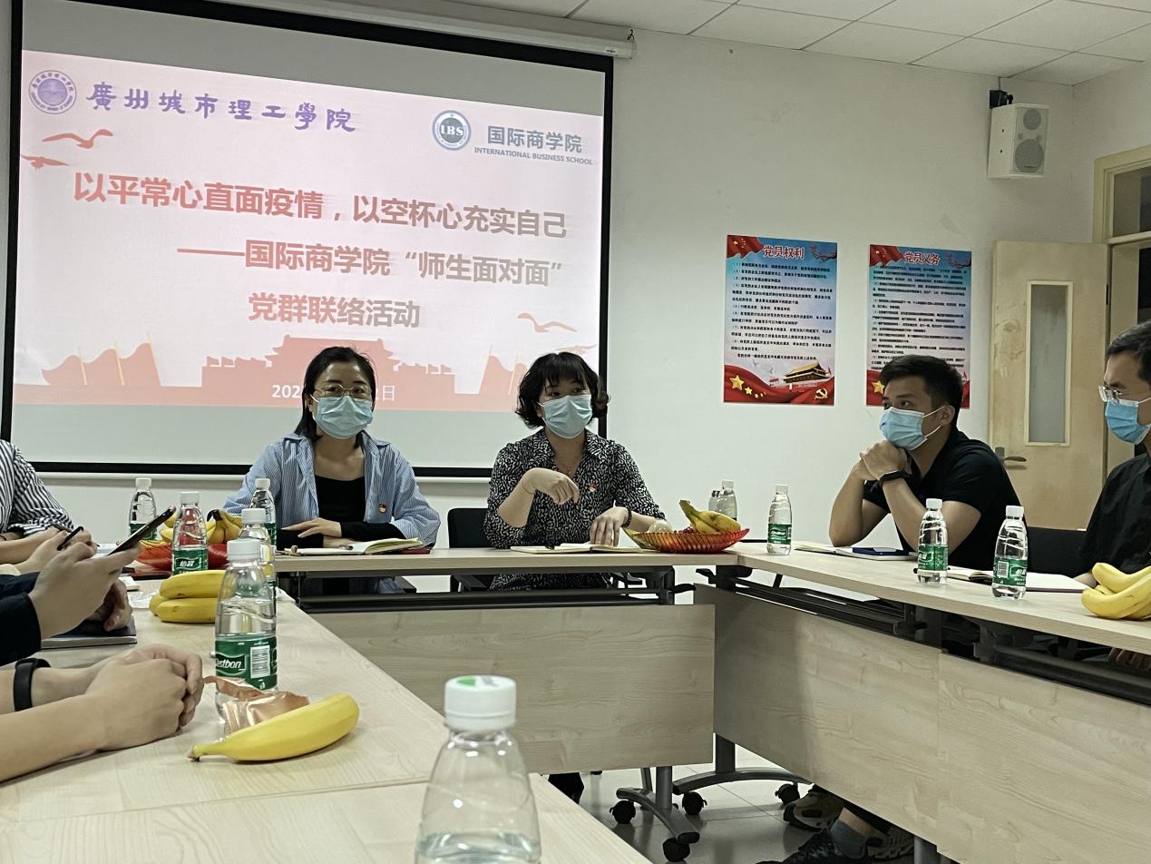 最后,刘佳表示理解同学们现阶段学习、生活遇到的不方便、不适应;赞许同学们理性冷静的发表观点、真诚主动与老师沟通、遵守校规校纪,展现了国商学子“胸怀天下,心系祖国”的格局。她鼓励同学们要以平常心面对疫情防控、努力充实自己。同时,她要求所有师生党员,越是在关键时刻,站位越要高、工作越要靠前、服务越要精准,牢记入党誓词,履行党员义务。
