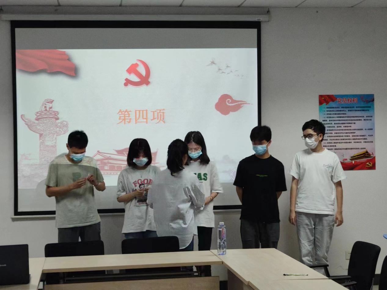 会议第五项,奏放国际歌,庄祉祎老师为新发展的预备党员同志颁发党徽。