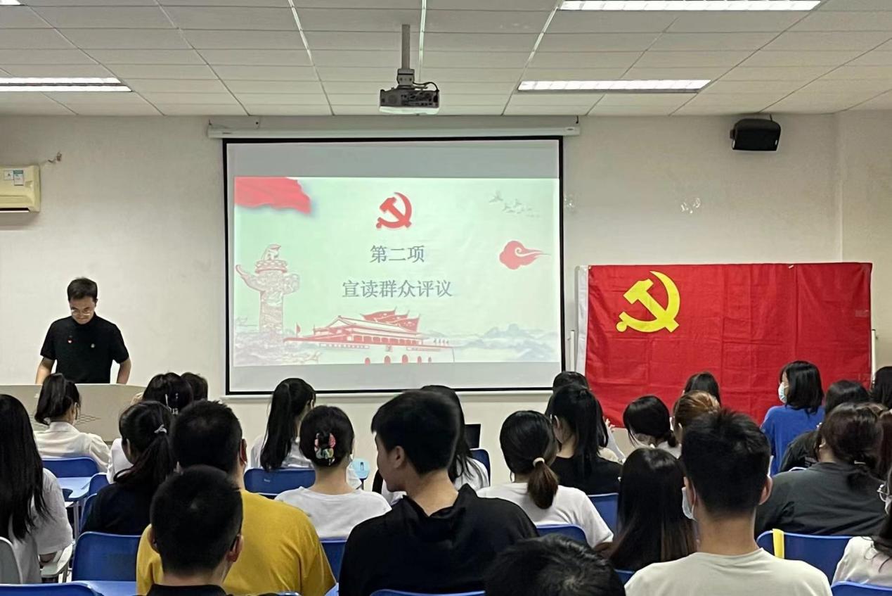 会议第二项,杨颖宣读群众评议。评议内容公正、客观,根据群众意见,总体上各位预备党员态度端正,已具备党员的基本素质。