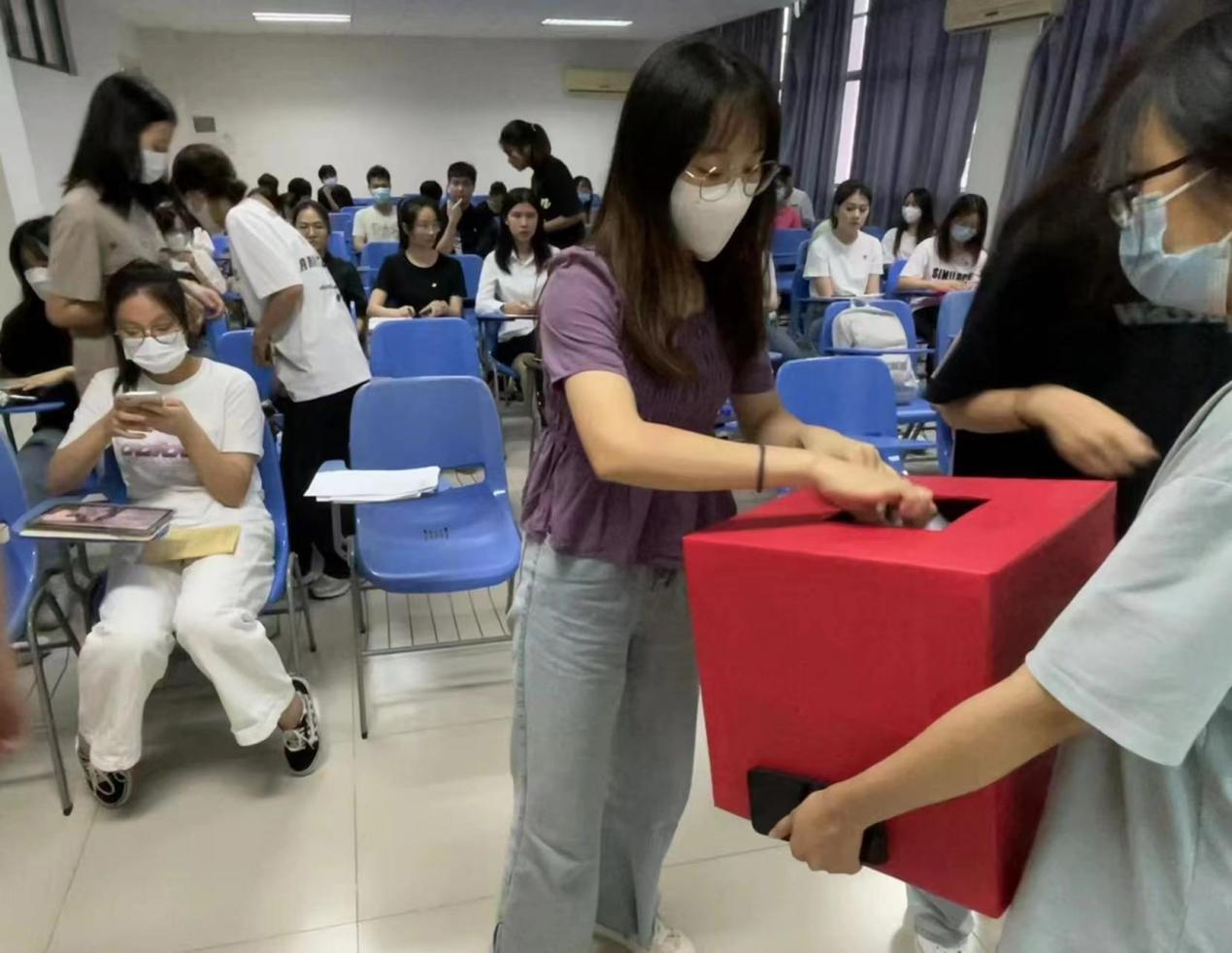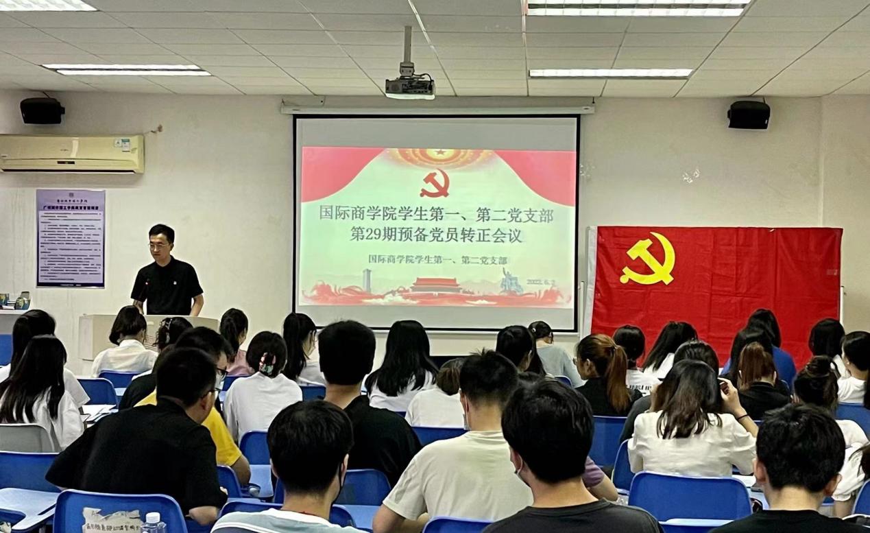 本网讯(记者 林素金)6月2日晚,国际商学院学生第一、第二党支部在A6-501召开了第二十九期预备党员转正会议,讨论表决关于张志扬等13名预备党员转正事宜。国际商学院学生第一党支部书记庄祉祎、学生第二党支部书记黄少芬以及70名学生党员参与本次会议,会议由学生第一党支部副书记甄诚同志主持。