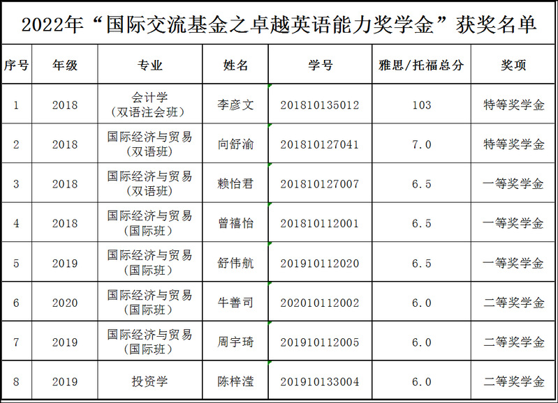 全院师生: 为鼓励在校学生提高外语水平、进一步扎实推进学校国际项目、提高学校国际化人才培养质量,2022年5月,我校组织开展了“国际交流基金之卓越英语能力奖学金”评选工作,并就评选结果进行了公示。 现公布我院奖学金获奖名单(见附件)。希望获奖个人珍惜荣誉,再接再厉,保持积极上进的求学态度,同时发挥好榜样作用,心怀感恩,以优异的成绩回报国家,回报社会。