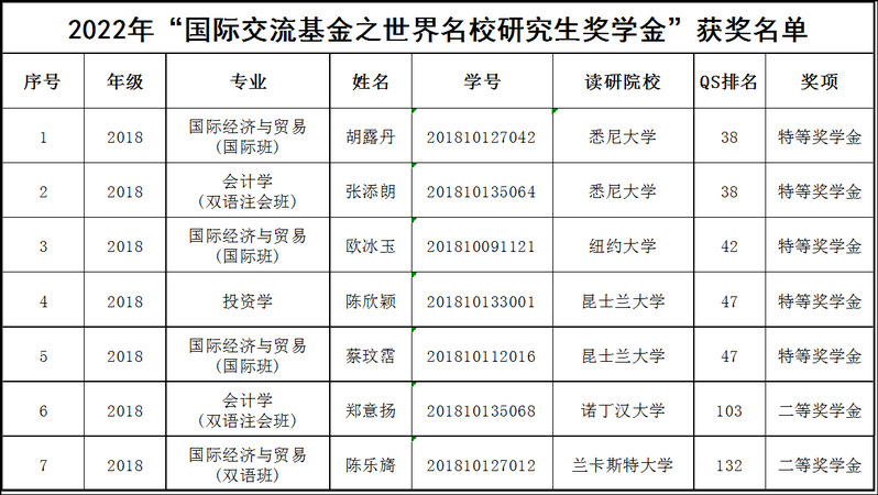 为鼓励优秀学生报考世界名校研究生、支持大四学生赴世界名校深造、树立优秀学生典型、提高学校人才培养质量,2022年5月,我校组织开展了“国际交流基金之世界名校研究生奖学金”评选工作,并就评选结果进行了公示。