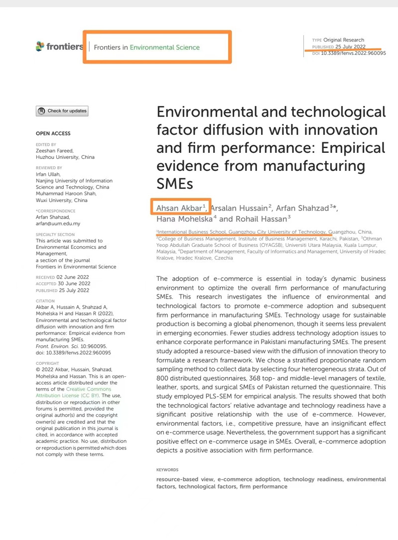 Akbar副教授在SSCI期刊《Environmental Science》上以第一作者身份发表论文《Environmental and technological factor diffusion with innovation and firm performance: Empirical evidence from manufacturing SMEs》。