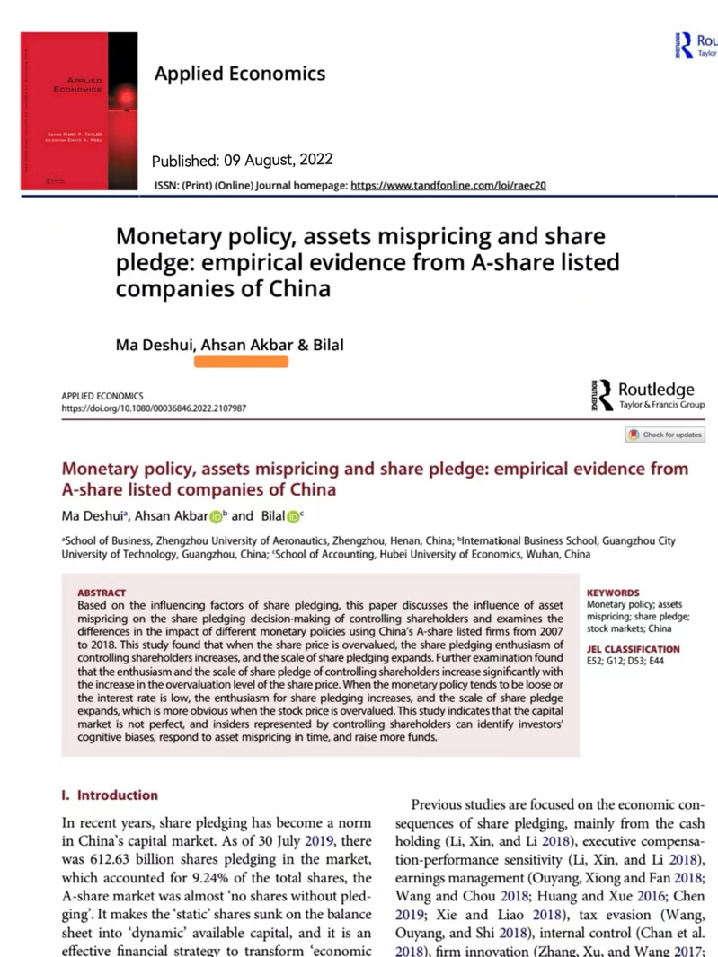 Akbar副教授在SSCI期刊《Applied Economics》上以通讯作者身份发表论文《Monetary policy, assets mispricing and share pledge: empirical evidence from A-share listed companies of China》。