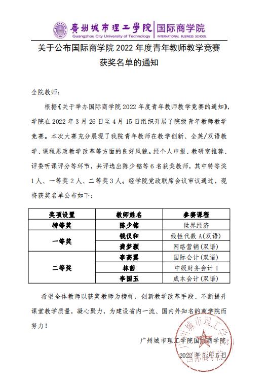 关于公布国际商学院2022年度青年教师教学竞赛获奖名单的通知