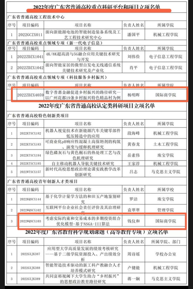 其中,由我院杨明晖副教授负责的“数字普惠金融促进乡村振兴的路径研究—以广州花都 19 条乡村振兴特色精品村为例”获批广东省普通高校重点领域专项(科技服务乡村振兴),这是我院人文社科领域第一个获批的省重点领域专项,为学科交叉融合发展提供了一个新的研究平台。