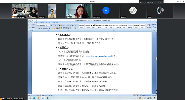 随后,国际教育与交流中心相关负责人回顾了2022年我校国际合作项目及我校与英国西英格兰大学合作的情况,并对学生开展涉外纪律、出入境、防疫、人身财产、网络信息等方面的安全教育。最后,张凤春主任总结道,“平安留学,不负青春,希望各位同学不仅是学校国际项目的参与者,更是建设者、推动者。期待各位学有所成,平安归来。”