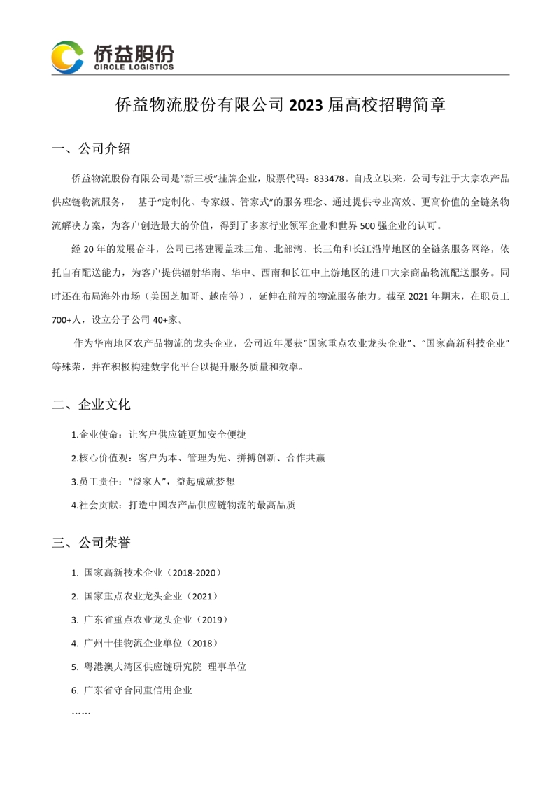 【招聘】侨益物流股份有限公司(国家重点农业龙头企业)