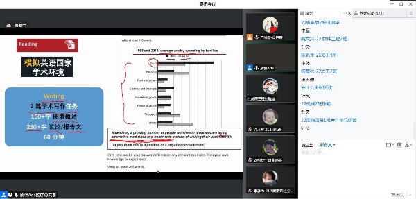 本网讯(记者 黄卉菁 钟宇琛)为提升我校学生英语能力,帮助有意向赴国/境外读研的学生提前规划和准备,11月3日,国际教育与交流中心邀请资深雅思考试培训师成怡通过线上形式开展英语水平考试讲座。讲座吸引了来自各学院的906名学生参加。