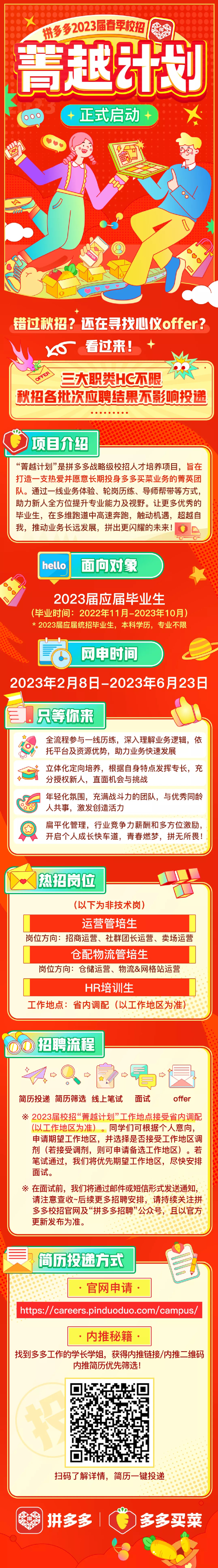 “菁越计划”是拼多多战略级校招人才培养项目,旨在打造一支热爱并愿意长期投身多多买菜业务的菁英团队。通过一线业务体验、轮岗历练、导师帮带等方式,助力新人全方位提升专业能力及视野。让更多优秀的毕业生,在多维跑道中高速奔跑,触动机遇,超越自我,推动业务长远发展,拼出更闪耀的未来。