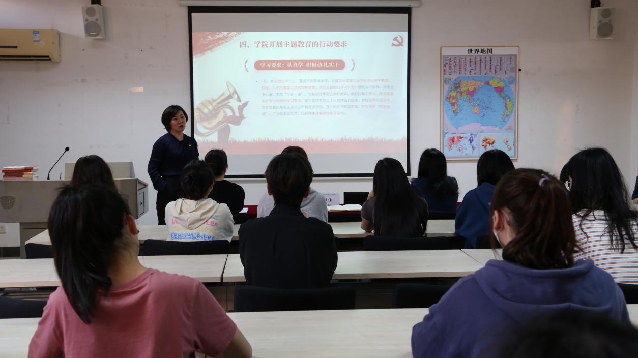会上,刘佳带领师生党员专题学习习近平总书记关于主题教育的重要讲话精神。她指出,深入开展学习贯彻习近平新时代中国特色社会主义思想主题教育,是党中央为全面贯彻落实党的二十大精神、动员全党同志为完成党的中心任务而团结奋斗所作出的重大决策部署,是深入推进新时代党的建设新的伟大工程的重大部署。她对学院各党支部和广大党员干部在“学思践悟”方面提出三点要求:一要“认真学”,坚持原原本本学,学透会议精神,准确把握主题教育的总要求;二要“积极动”,坚持问题导向,将实际问题进行调查梳理,把主题教育焕发出来的干事创业热情转化为推动高质量发展的工作实效;三要“扎实干”,全院党员和干部要深刻认识主题教育的重大政治意义、理论意义、实践意义,自觉把思想和行动统一到习近平总书记重要讲话精神和党中央、省委部署要求上来,紧紧锚定目标要求,主动担当作为,脚踏实地。