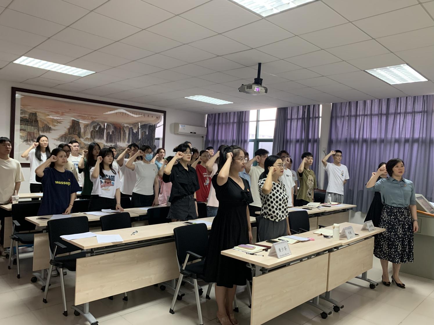 党课在庄严的国歌声中拉开序幕。随后,全体师生党员高举右手,在刘佳的带领下重温入党誓词。铮铮誓词,声声入心,在响亮的誓言中,赓续绵延的是传承百年的红色血脉,历久弥坚的是丹心闪耀的党员使命。