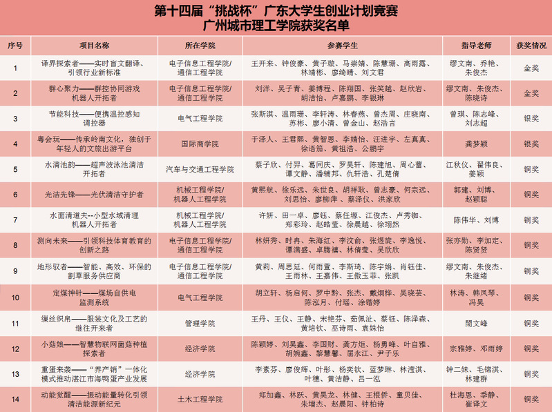 5月17日-19日,第十四届“挑战杯·广州工行”广东大学生创业计划竞赛终审决赛在华南农业大学举行。我校报送的14个项目获得省赛金奖2项、银奖2项、铜奖10项的好成绩,获奖率100%,获奖项目总数位居全省民办本科高校首位,总成绩再创我校“挑战杯”广东大学生创业计划竞赛历史新高。