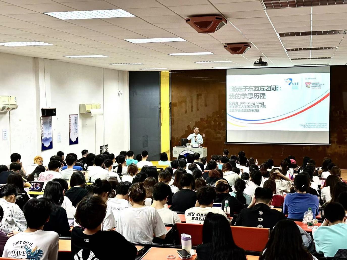 本网讯(记者 杨斯淇 黄凤娟)为进一步增强师生的国际视野与认知,6月12日,国际商学院在A9-101举办了一场主题为“游走于东西方之间—我的学思历程”的主题讲座。讲座邀请新加坡南洋理工大学国立教育学院语言学暨语言教育教授吴英成担任主讲嘉宾,国际商学院院长安然、党总支副书记梁伟滔、副院长陈少铭及180余名师生出席讲座,讲座由安然主持。