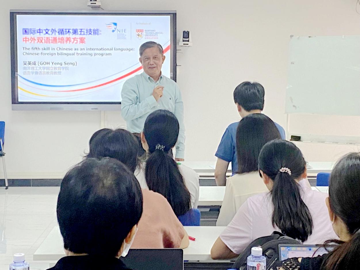 6月12日下午,吴英成还面向国际商学院、外国语学院的教师开设了一场主题为“国际中文外循环第五技能: 中外双语通培养方案”的讲座。吴英成在分析中国“以国内大循环为主体、国内国际双循环相互促进”的新发展格局基础上,提出以“中文内外双循环为依托”的国际中文教育可持续发展新战略。他指出,我们要了解语言的内循环和外循环功能,要懂得自己眼里的自己和他人眼里的自己是不一样的,要学会从外部视角看中国,也就是要理解语言的外循环功能。他还跟老师们探讨了语言经济学在国际贸易、跨文化交流、语言教育等领域的应用,指出当前国际中文外循环就业市场需要大量的英语好,专业精的复合型人才,我们应顺势而为,做好中外双语通人才的培养。