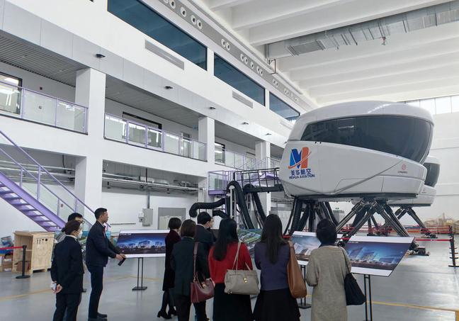 最后,国际商学院在企业代表的陪同下参观了薛航集团旗下的美华航空项目基地。据介绍,该基地规划总用地约300亩,计划投资超过70亿元人民币开发建设,以“科技创新驱动发展”为理念规划,分两期建设。美华航空代表向学院介绍飞行员的培训模式,并带领大家体验模拟飞机驾驶场景,学院代表均对此赞叹不已。