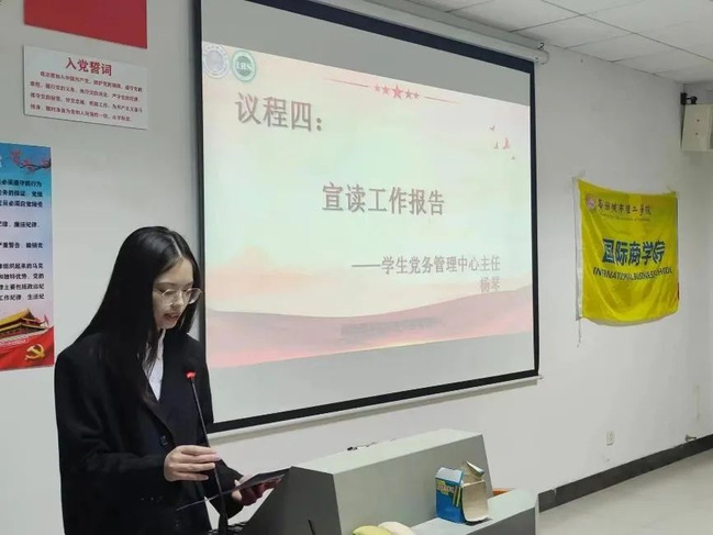 学生党务管理中心主任杨琴作2021-2022学年学生党务管理中心工作汇报并宣读《关于广州城市理工学院国际商学院学生党务管理中心第二届干部卸任方案报告》。她分别从组织工作、党建工作、宣传工作等方面对学生党务管理中心过去一学年的工作进行回顾总结,对未来工作进行展望。