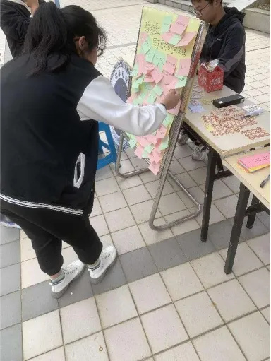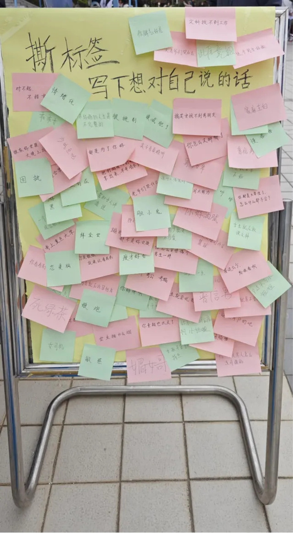 “标签”是片面的、孤立的,而我们是鲜活的,多元的,不应被所谓的人设所框柱,一张又一张的标签,是偏见、是束缚、是同学们的陈见与误解,那么亲手将它们撕下,是成长,也是突破。如果撕掉了一张标签,那么恭喜你!勇敢的走出了属于自己人生路途中必不可少的一步!我们永远为你的勇气喝彩!当然在撕标签的同时,实践部成员们也鼓励同学们对“自己”留言,将这份承载着希望和自由的便利贴贴在立牌上,是对自己的肯定,也是对未来的认可。这样简单的“一撕一贴”对应了同学们心态的转变,也帮助同学们挣脱心灵的束缚,远离被定义的焦虑。