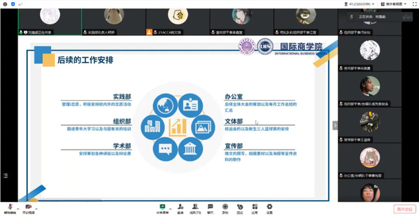 最后,学院团委、学生会主席团成员对后续各部门组织的工作安排都进行了进一步调整分配,以及对今后学院学生会的常态化工作提出了要求。相信这一系列规划将有助于国际商学院学生会更好地发展,提供给国商学子更好的服务,推动同学们的全面发展,为广东高质量发展贡献力量。
