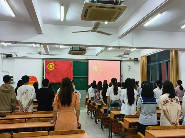 首先,全体起立奏唱国歌。伴随着庄严激昂的旋律,全体同学肃然起敬,歌唱声响彻整个教室。随后宣读《广州城市理工学院国际商学院团支部团员大会选举办法》——落实班团一体化制度。