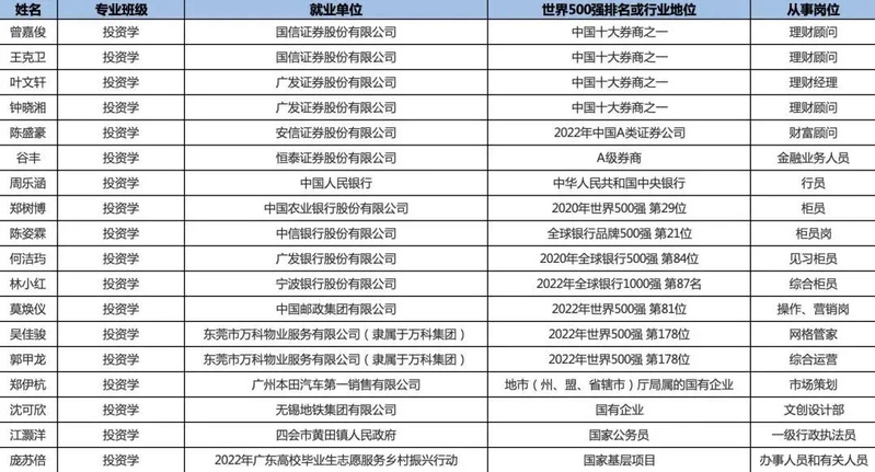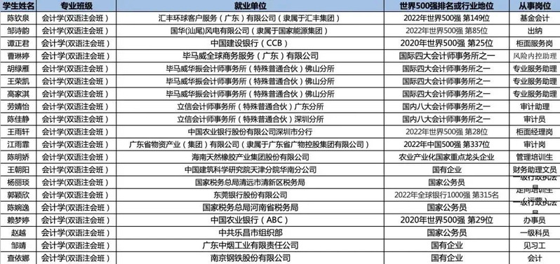 毕业生就业质量好,就业率和起点薪酬水平位居同类院校前列。近五年来,学院毕业生初次就业率96%以上,毕业生就业率和薪酬水平位居同类院校前列。毕业生广泛分布在国家金融机构、税务部门、地方政府、世界500强企业或行业龙头企业,如:中国人民银行、中国工商银行、中国银行、中国建设银行、中国农业银行、广东发展银行、汇丰银行、国信证券、国泰证券、香港富昌证券、广发证券、中国人民保险、太平洋保险、阿里巴巴、京东、中国移动、中国邮政,以及四大会计师事务所的毕马威、安永、普华永道、世界著名管理咨询公司埃森哲咨询公司等国内外名企。