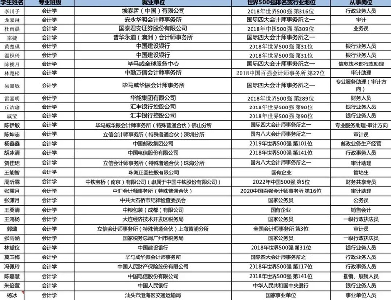 毕业生可在国际四大会计师事务所或国内大型会计师事务所从事审计执业、税务筹划及管理咨询等工作;或在跨国公司、外资企业或机构、中外合资企业、企事业单位、金融投资机构从事会计核算、财务管理、理财咨询和经营管理等工作;或继续攻读硕士研究生;出国留学深造。