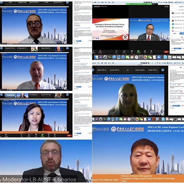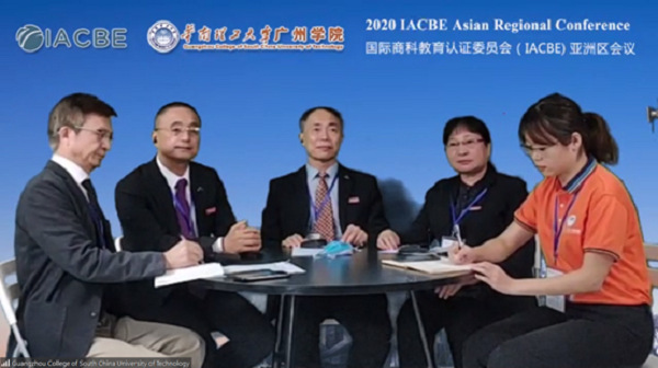 本网讯(记者 谢晓敏)为加快扩大新时代教育对外开放,致力深耕专业认证培养模式,提质增效国际型人才培养成果,11月5日下午,由我校承办的2020国际商科教育认证委员会(IACBE)亚洲区会议在线上正式召开,并取得圆满成功。广东省教育厅交流合作处处长李金俊、IACBE主席Phyllis Okrepkie、IACBE副主席Ted Collins、IACBE亚洲区主席Robert Gharios、IACBE亚洲区副主席、我校常务副校长曾志新,副校长李华钢、林颖等出席了会议。