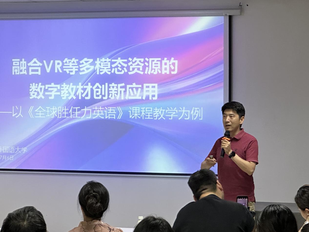 9月28日,工作坊在A8-109继续举行。翟铮教授以“融合虚拟仿真(VR)实践活动等多模态资源的数字教材创新性应用”为主题,介绍了以《全球胜任力英语教程》为例的数字教材创新教学方法。他展示了如何通过整合视频、VR模拟场景等多模态资源,构建沉浸式学习体验,(黄雅茹 摄)激发学生的学习兴趣,解决传统教材教学的痛点问题。翟教授指出,数字教材的广泛应用不仅提升了课堂互动性,还在国际化人才培养模式的创新上发挥了重要作用。现场教师们纷纷表示,此次讲座为他们未来的教学工作提供了新思路和新方法。