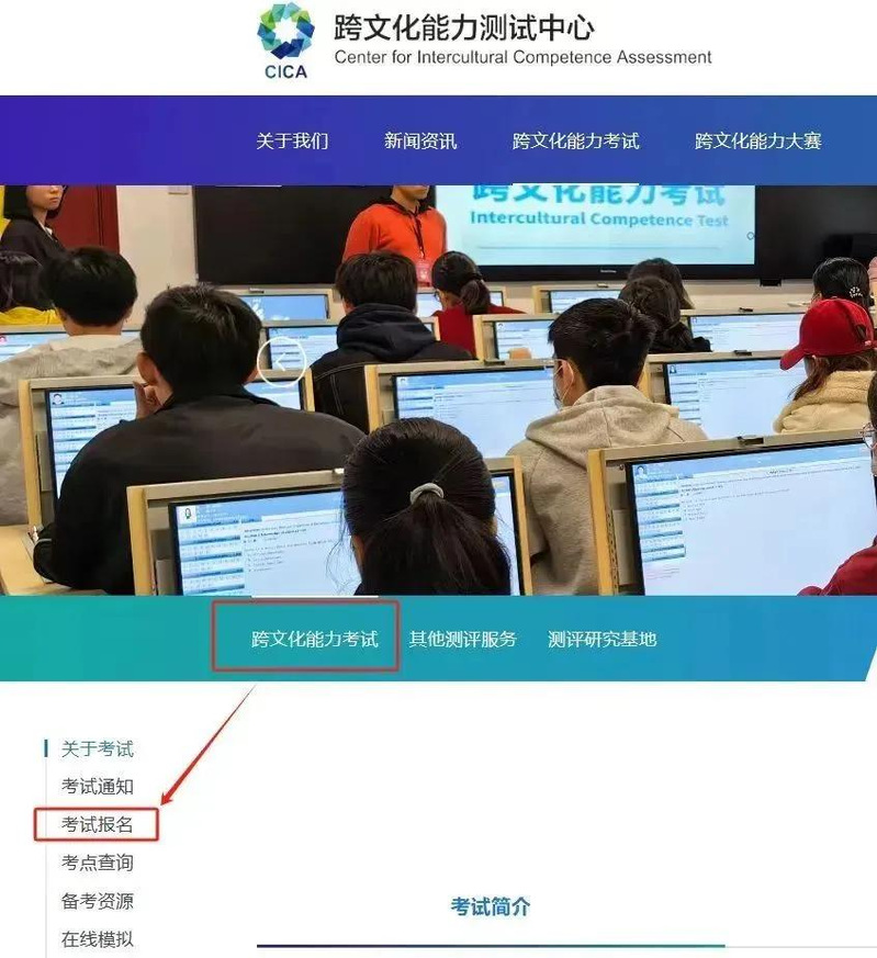 2. 点击“跨文化能力考试”板块 - “考试报名”进行在线注册、报名及缴费(推荐考生使用电脑端登录操作)。