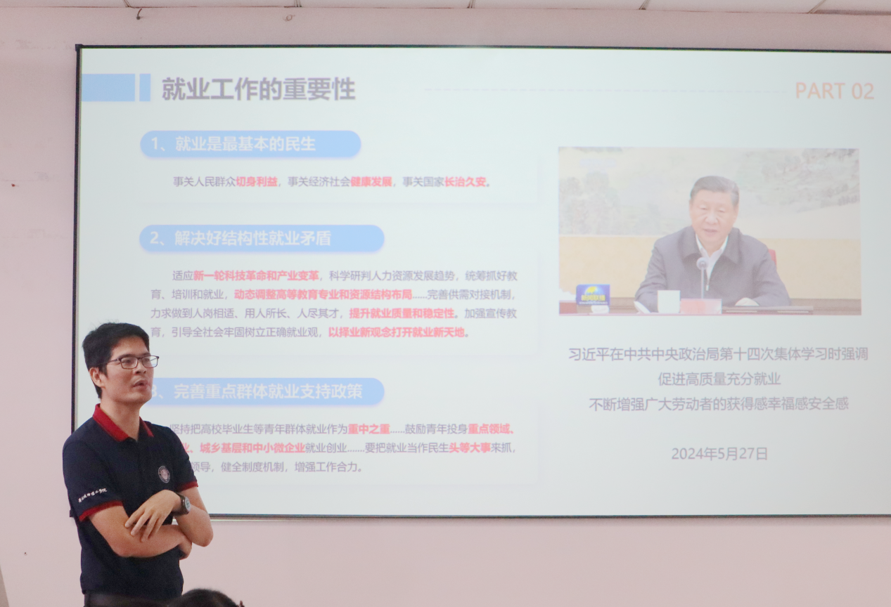 梁伟滔就招生就业工作进行部署。他详细分析了近五年学院招生录取的情况,结合今年招生工作面临的形势和任务,部署2024年招生宣传工作。他强调招生是学院发展的基石,并号召全院教职工全力以赴参与招生工作中来。他带领与会人员学习习近平总书记在中共中央政治局第十四次集体学习时的重要讲话精神,强调就业工作是一项重要的民生工程,也是学院人才培养质量的综合体现。希望老师们加强宣传引导、深挖就业资源、做好职业引航,进一步促进学院就业工作高质量发展。