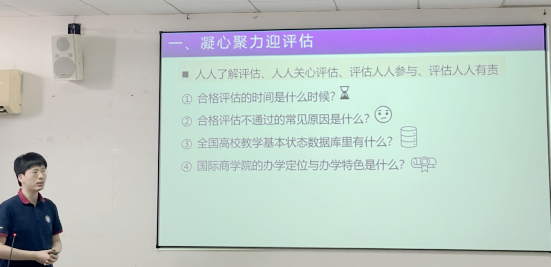 陈少铭作“同心聚力,推进本科教学工作迎评攻坚战”报告,并就期末教学科研工作进行总结及安排。他从“凝心聚力迎评估、真刀真枪促评建、强化责任抓落实”三个部分展开报告,指出当前学院及老师们面临的挑战和困难,并提出针对性的解决方案。他希望教师们保持信心,加强团队合作,通过全员参与和共同努力严格管理课堂秩序、以良好教学带动学风建设,全面提升教学质量,促进学院内涵式发展。