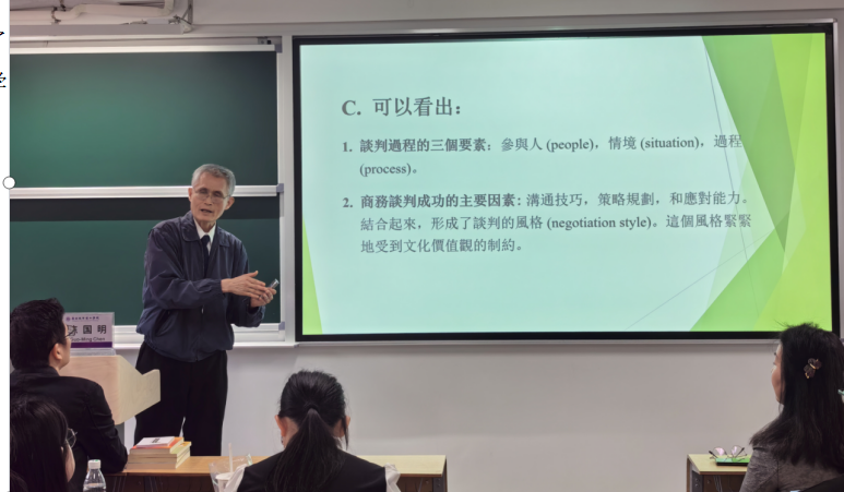 讲座中,陈国明教授围绕“跨文化沟通与商务谈判”这一主题展开了深入探讨。陈教授详细阐述了商务谈判的主要目的和步骤,并分析了跨文化谈判中可能遇到的挑战和应对策略。陈教授指出,商务谈判不仅涉及产品价格、交付时间等具体条款的协商,更需要在不同文化背景下建立彼此之间的信任和理解。他通过生动的案例和实证研究,展示了文化价值、文化行为和文化认知在谈判过程中的重要作用。同时,陈教授还强调了跨文化商务谈判中需要具备的基本能力,包括语言沟通能力、文化敏感性和冲突解决能力等。陈教授风趣幽默,语言生动,结合自身经历和丰富案例,将抽象的理论知识讲得深入浅出,让听众受益匪浅。