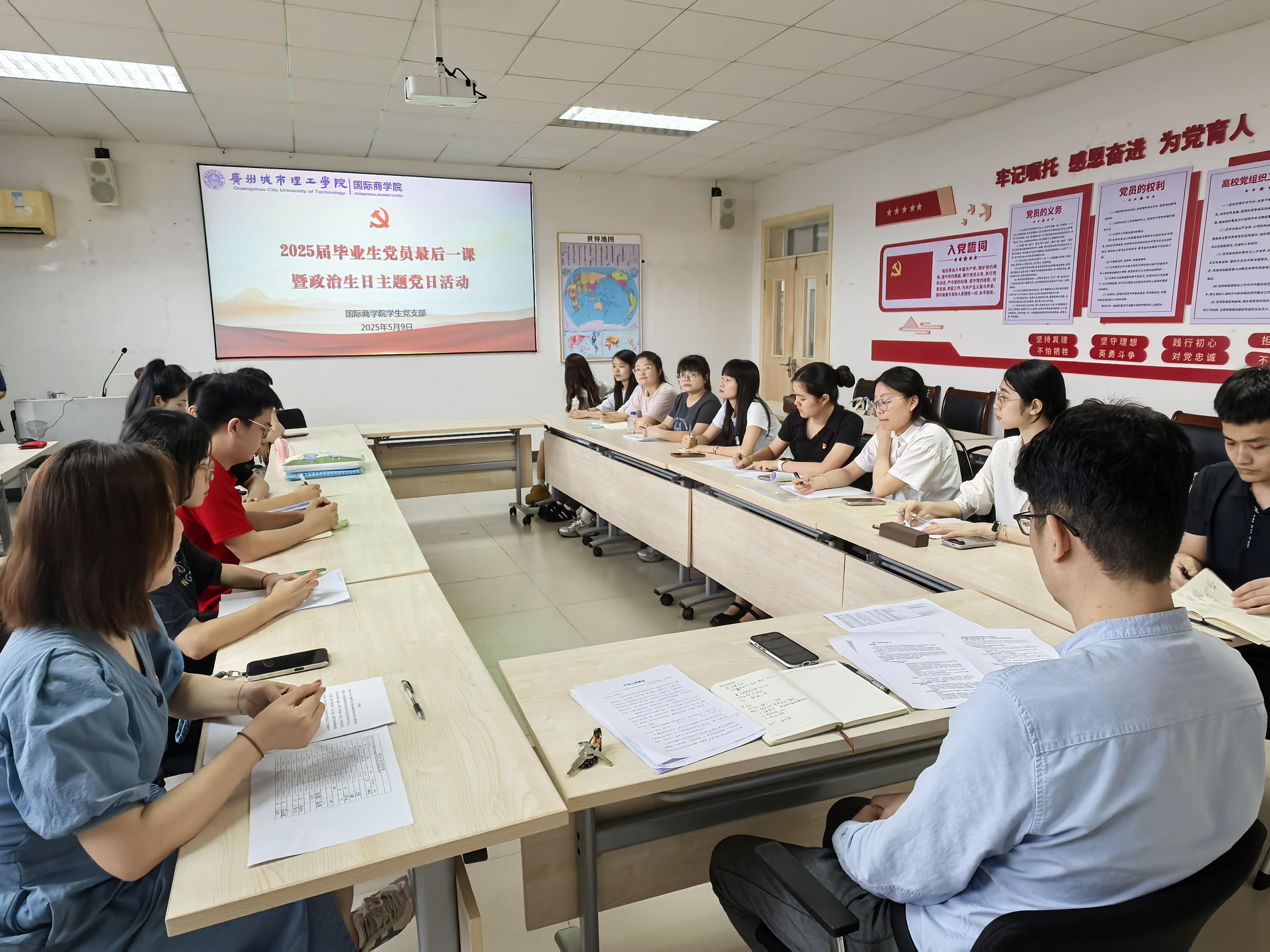 本网讯(记者 庄祉祎 叶建辉)为进一步强化学生党员的政治素养与身份意识,落实党员教育长效机制,5月9日中午,国际商学院在A6-505开展2025届毕业生党员最后一课暨同过政治生日主题党日活动,学院党总支副书记梁伟滔出席活动并讲授专题党课,学生党支部书记、副书记及全体毕业生党员参会。