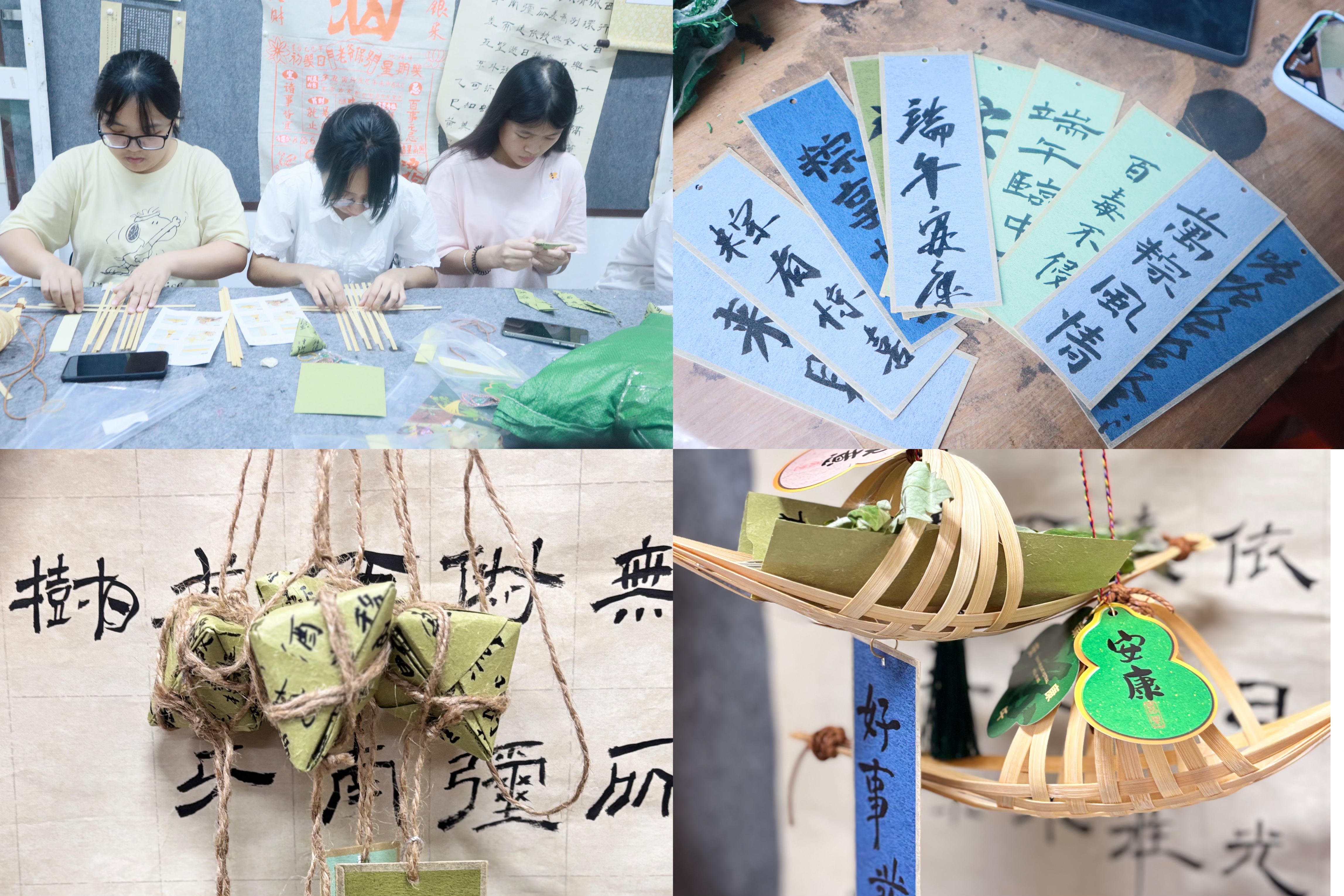 手工制作分为三个部分:艾草花束制作、竹编小船制作和书法粽子DIY。师生们在忙碌的工作学习生活中静下心来,通过自己动手一点一点制作出精美的手工作品,不仅体会到传统手工艺的精妙与乐趣,在这个过程中也缓解了工作压力和学业压力,也增强了对传统文化的了解与认同。