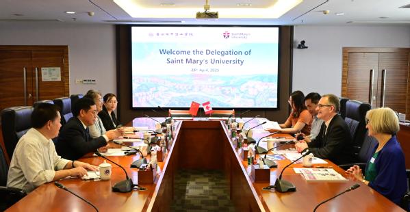 Robert Summerby-Murray对我校表示感谢,并介绍了圣玛丽大学近期在创新技术方面的发展。他表示,作为一所建校历史超过200年的大学,圣玛丽大学致力于在高等教育领域运用创新技术,2023年落成的索贝创新园区(Sobeys Inspiration Hub)旨在鼓励不同专业领域的师生合作开展创新创业实践,而且楼栋墙面使用太阳能充电板,是创新创业实践与绿色能源技术的有机融合。另外他还提到,在近期与加拿大驻广州总领事的会面中,他向总领事汇报了两校长久以来的合作关系和即将续签合作协议的最新成果,得到了总领事的充分肯定和大力支持。他说道:“中加关系正处于孕育发展机会的关键时期,圣玛丽大学与广州城市理工学院在以生为本、积极开展国际交流合作等方面理念一致,两校将继续密切开展合作。”