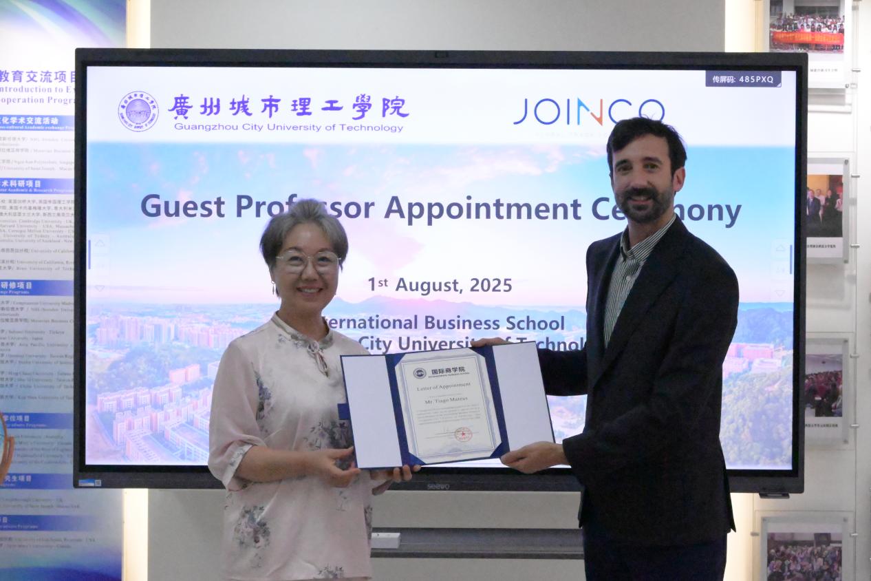 在会谈结束前的聘任仪式上,安然代表学院向Tiago Mateus颁发客座教授聘书。安然表示:“Tiago先生是葡萄牙注册商贸律师,在国际经贸和法律领域造诣深厚,致力于推动中欧经贸合作与产教融合发展。今年四月,他受邀参加广交会调研座谈会并发言,向国家及省市相关领导汇报了与我校协同培养国际商科人才的创新模式与实践成果。他的加入必将为我校应用型人才培养注入新动能。”Tiago Mateus对此表示感谢,并强调:“Joinco将持续践行企业社会责任,加强校企协同创新,将企业最新实践案例引入课堂,助力广城理培育具有全球胜任力的应用型人才。”