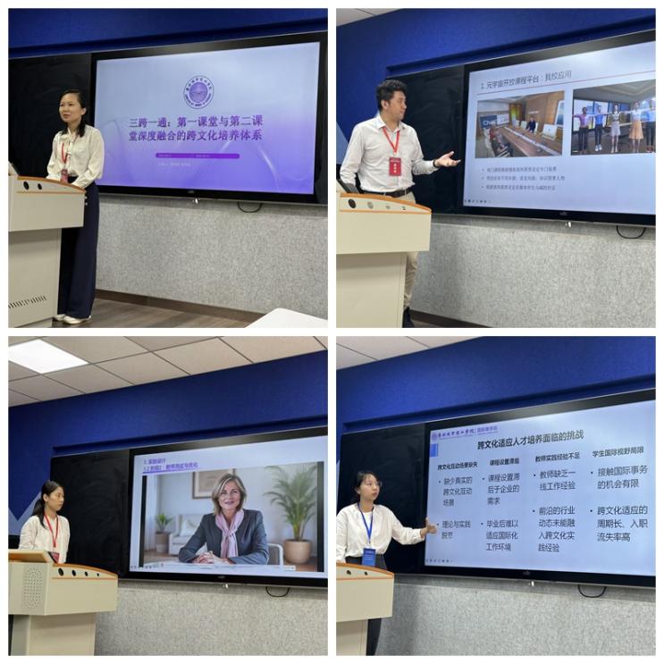 安然教授首先围绕我校商科教育模式的“四引擎”机制——“三跨一通、名校协同、AI赋能、名企联动”进行了总体介绍,集中展现了国际商学院在跨文化教育上的创新探索与实践成果。贺梦圆老师聚焦于课堂体系重构,提出通过第一课堂与第二课堂的深度融合,推动理论与实践的双向贯通,为学生跨文化能力的提升提供坚实支撑。王金鹏老师针对跨校协同,展示了利用元宇宙平台打造沉浸式学习空间的新构想,强调数字化技术如何突破地域限制,助力跨校与跨境的协作创新。彭鑫怡老师重点介绍了AI赋能在国际商务谈判教学中的应用,展示了AI平台如何通过即时反馈和动态模拟,帮助学生增强跨文化敏感度与策略适应力。面向校企联动,邹楚、陈贤贤老师结合实践案例,探讨了产教融合在跨文化适应型人才培养中的新路径,凸显了校企协同的实际效益与长远价值。