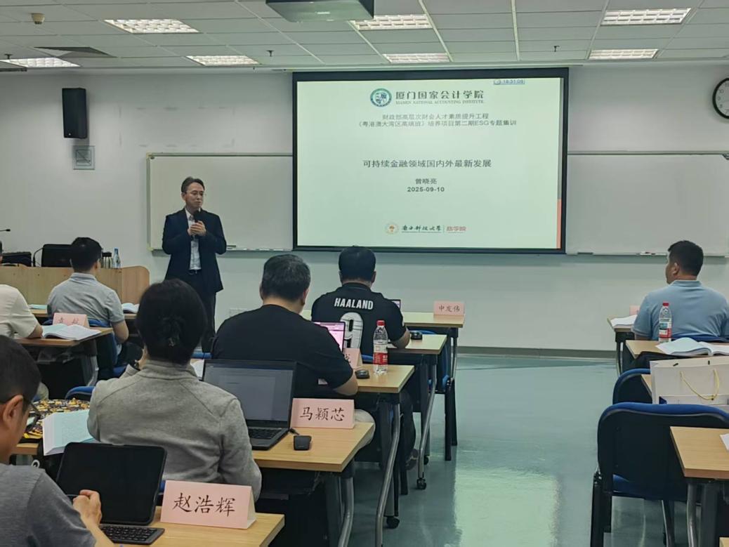 本网讯(记者 黄凤娟)9月8日至18日,国际商学院杨明晖教授(财政部高层次财会人才素质提升工程学员)在厦门国家会计学院参加以“可持续发展会计与ESG”为主题的集中培训。培训由财政部组织、厦门国家会计学院承办,课程聚焦可持续信息披露、绿色鉴证与ESG实务,围绕“双碳”背景下财会人才的治理能力与专业判断力开展系统培养。