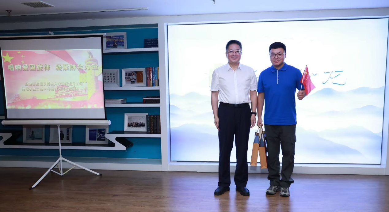 厦门国家会计学院院长丁友刚教授颁发爱国歌唱比赛奖项 杨明晖(右)代表班级领奖(杨明晖 提供)