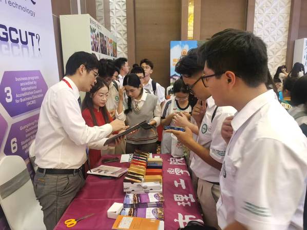现场咨询的学生热情高涨,从课程设置到校园生活,从就业前景到文化交流,学生们表现出了极大的兴趣与关注。1名前来现场咨询的越南的高三女生,她对中国文化十分感兴趣,尽管她的学校还没有开设中文课程,但她自学了3个月中文,已经能够用中文进行沟通,她非常希望能够到中国留学。安然鼓励该名学生继续学好中文,参加HSK考试,然后报名申请就读我校。一名来自老挝的高中学生非常喜欢中文,正准备到中国留学,但他还不知道选读哪个专业。梁伟滔建议他从老挝的经济发展需求出发,考虑报读我校的土木工程、电子信息工程、机械工程等理工类专业,学成之后到驻老挝的中资企业工作,建设老挝。