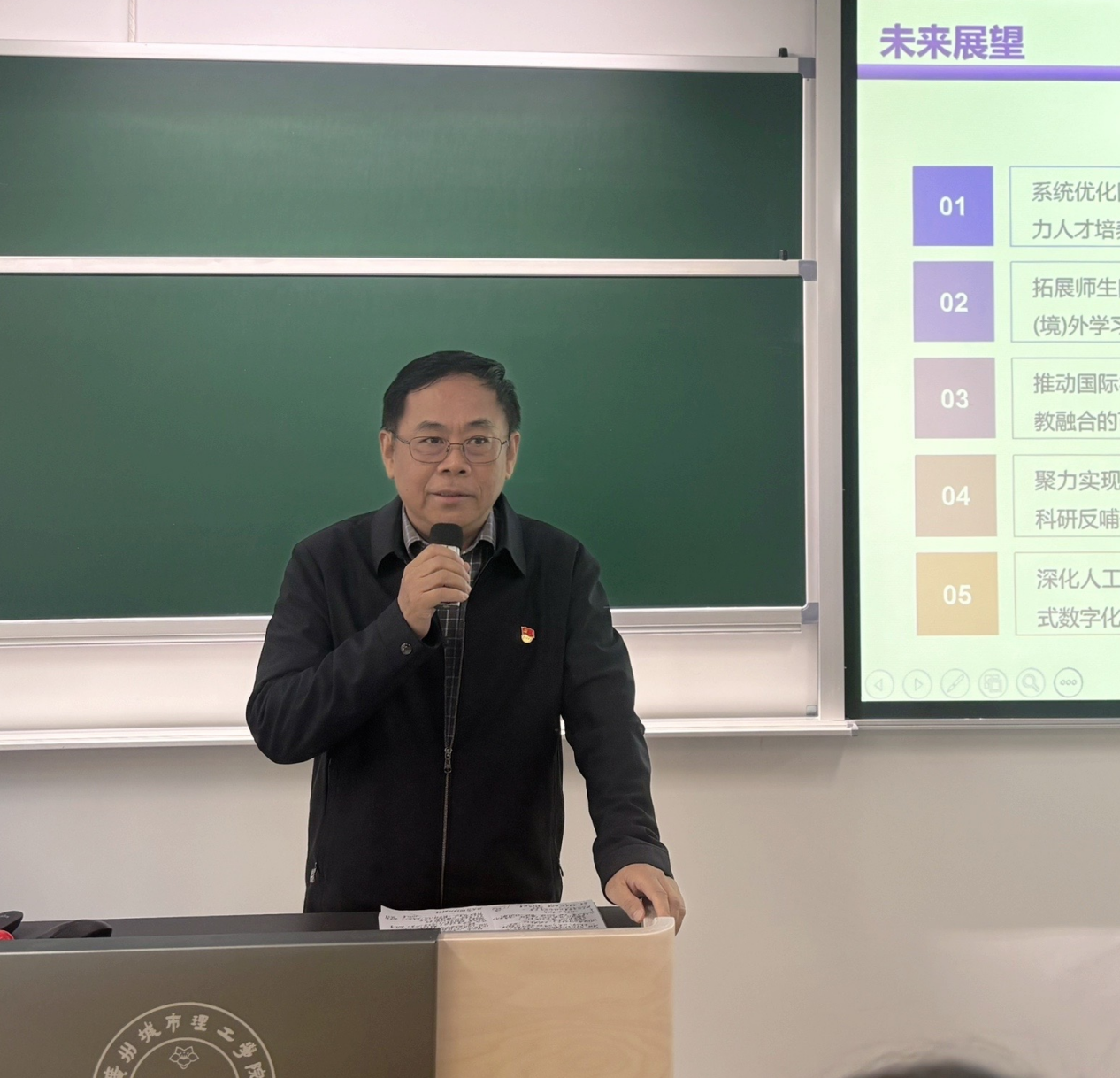 结合学院实际,梁伟滔提出发展要求:一是拥抱科技变革,推动人工智能与教学科研深度融合,培养学生科技应用能力;二是深化产教融合,强化校企合作与实践教学,助力学生对接产业需求;三是坚持立德树人,全体教师需修炼内功,在教学科研中融入育人元素;四是突出国际特色,持续拓展跨文化交流,提升师生全球胜任力,鼓励教师将国家战略部署融入课程建设与个人发展规划中。